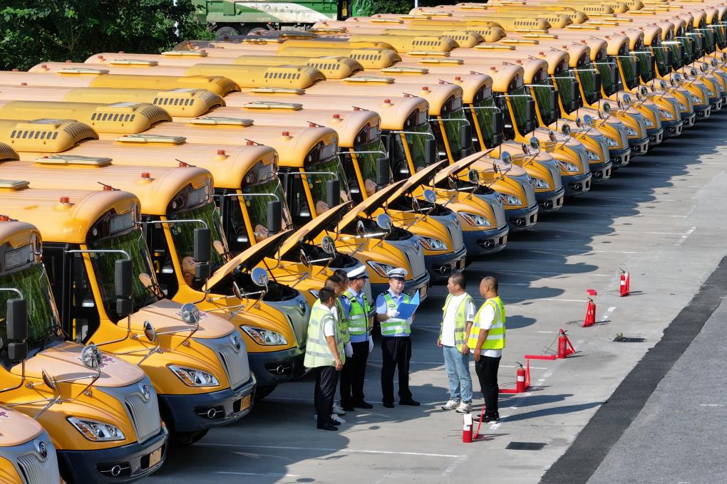 8月26日,江苏省扬州市宝应县公安局交管大队车辆管理所民警对辖区内校车开展专项检查,并向校车驾驶员宣传安全知识(无人机照片)。新华社发(沈冬兵 摄)