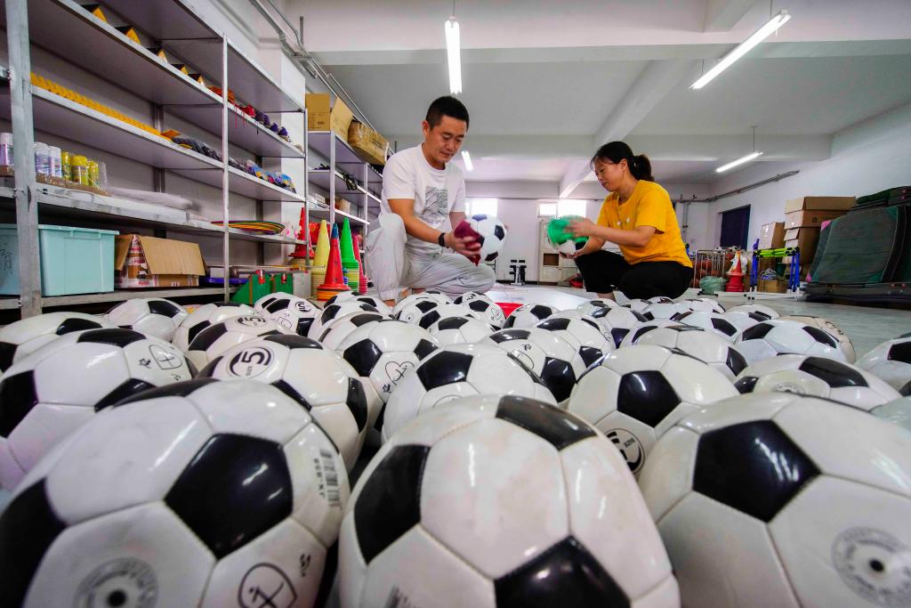 8月25日,河北省遵化市第二中学体育教师在擦拭整理足球。新华社发(刘满仓摄)