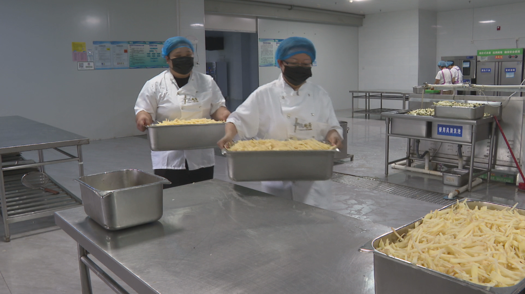 在河南省鹤壁市外国语中学后厨,学校组建的专业餐饮团队正在配餐。(霍丹 摄)
