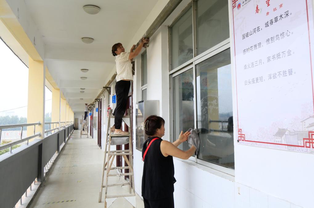 8月25日,工作人员在河南省洛阳市汝阳县直属初级中学进行校园卫生清理。新华社发(康红军摄)
