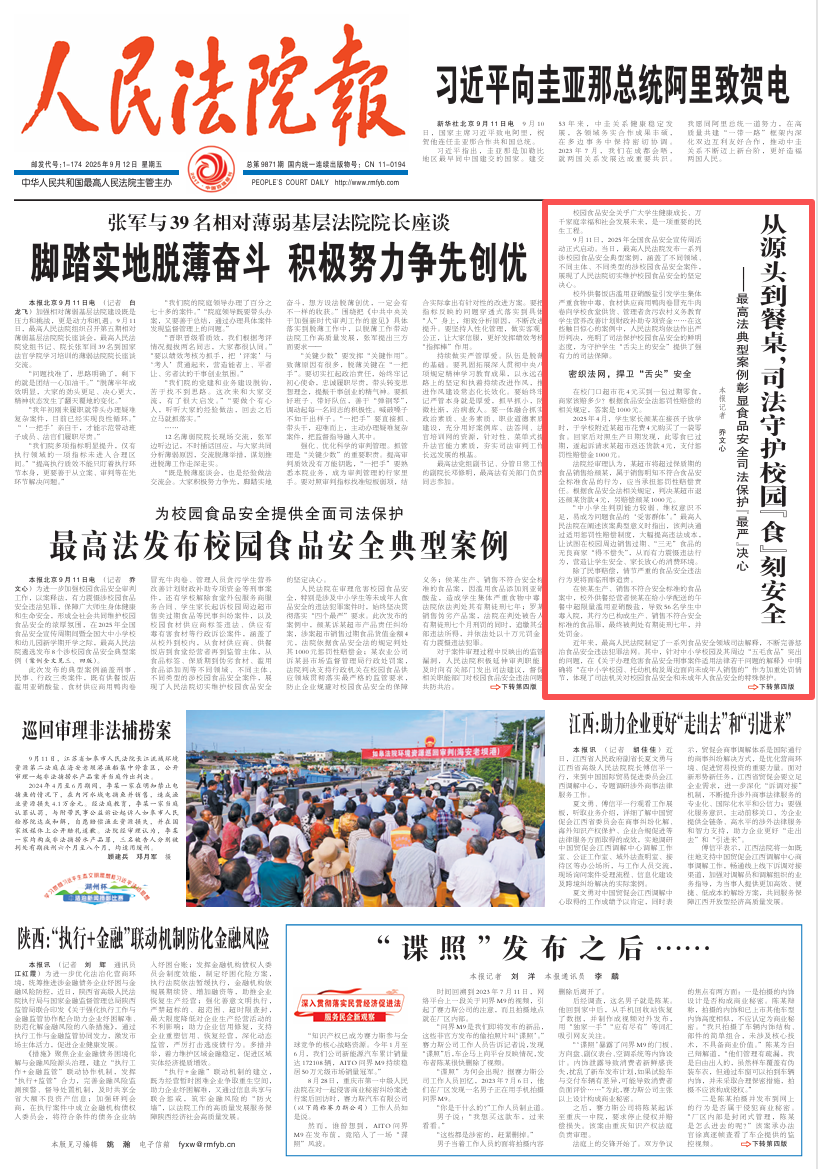 9月11日,2025年全国食品安全宣传周活动正式启动。当日,最高人民法院发布一系列涉校园食品安全典型案例,涵盖了不同领域、不同主体、不同类型的涉校园食品安全案件,展现了人民法院切实维护校园食品安全的坚定决心。